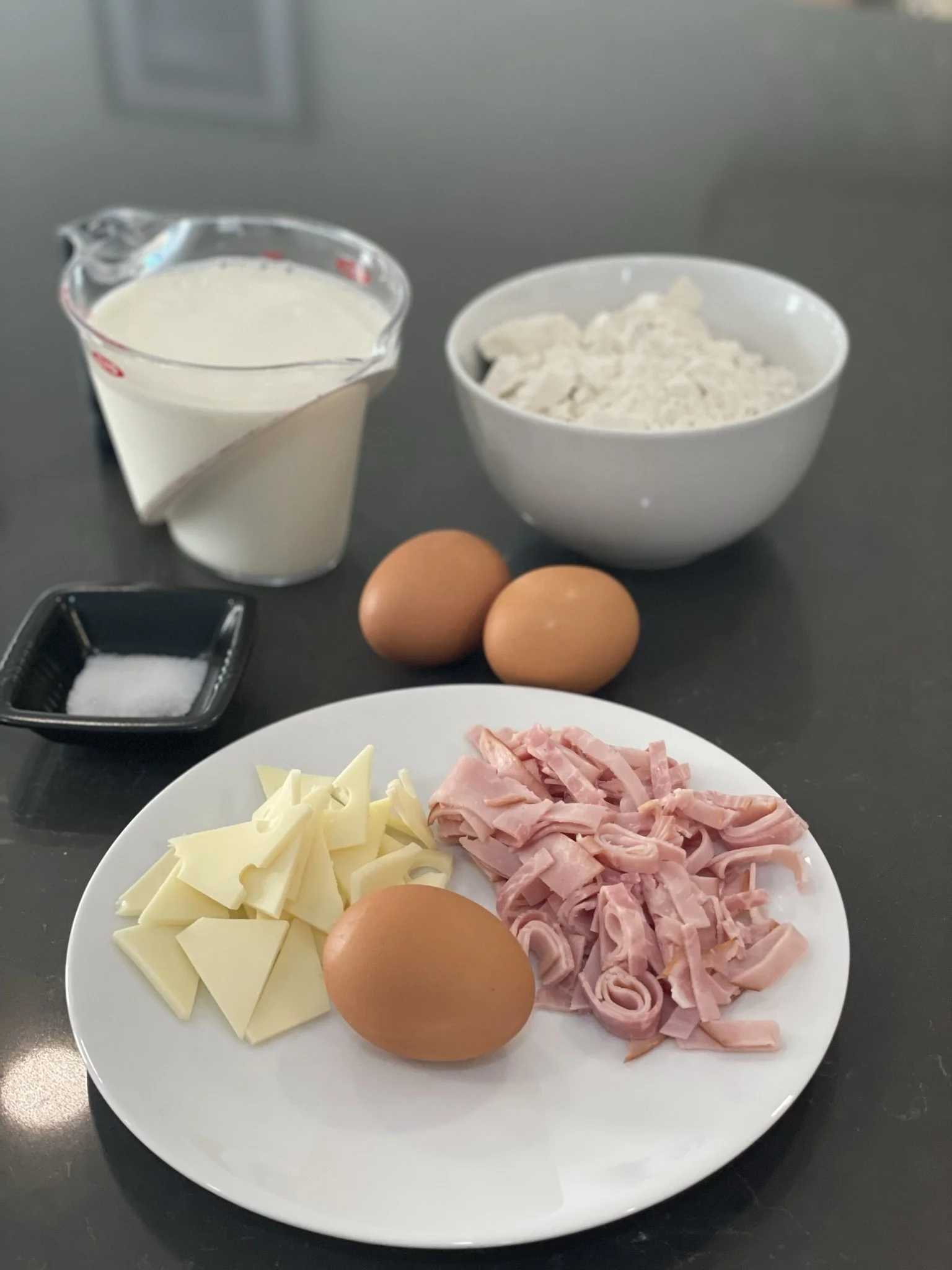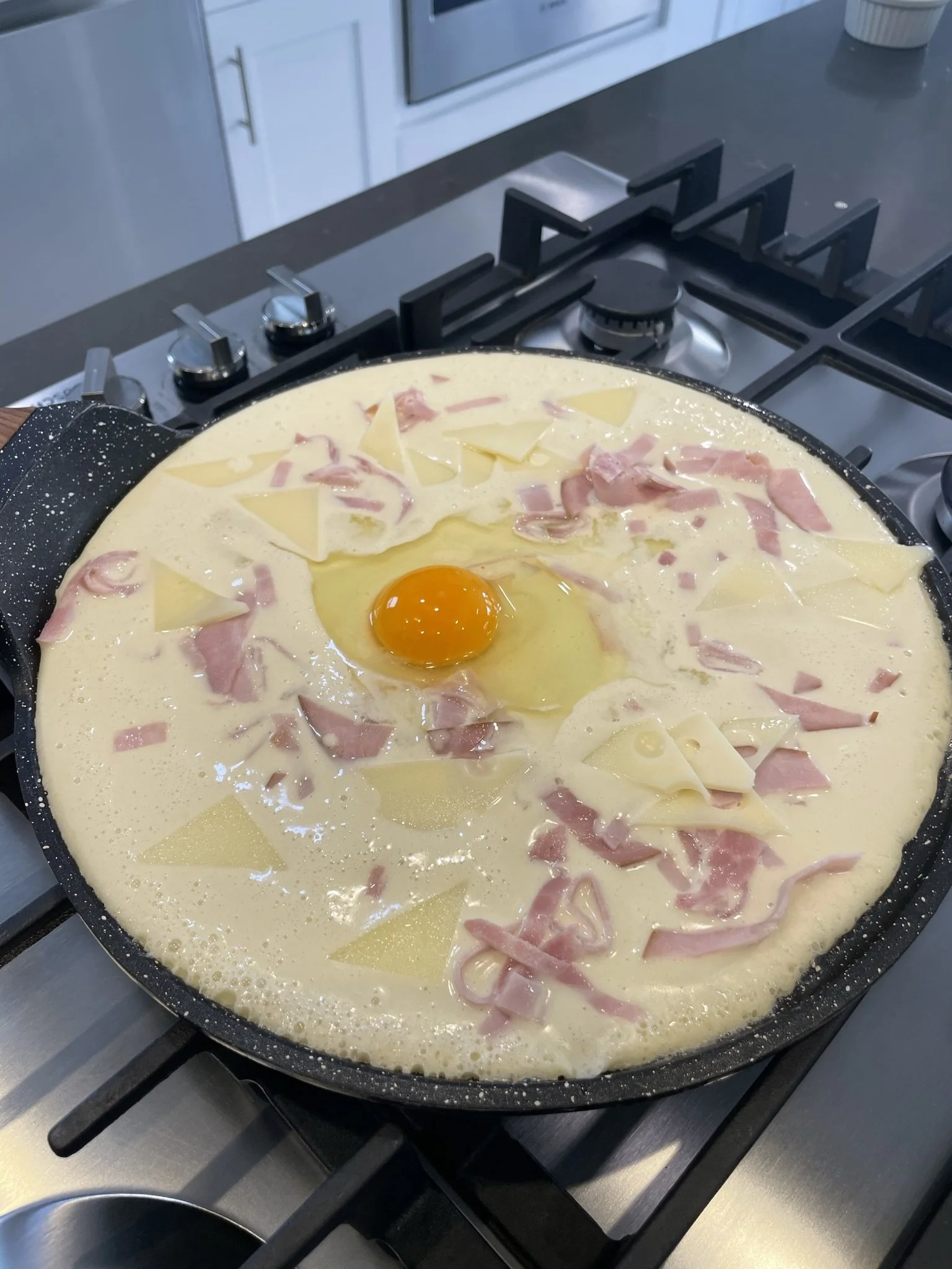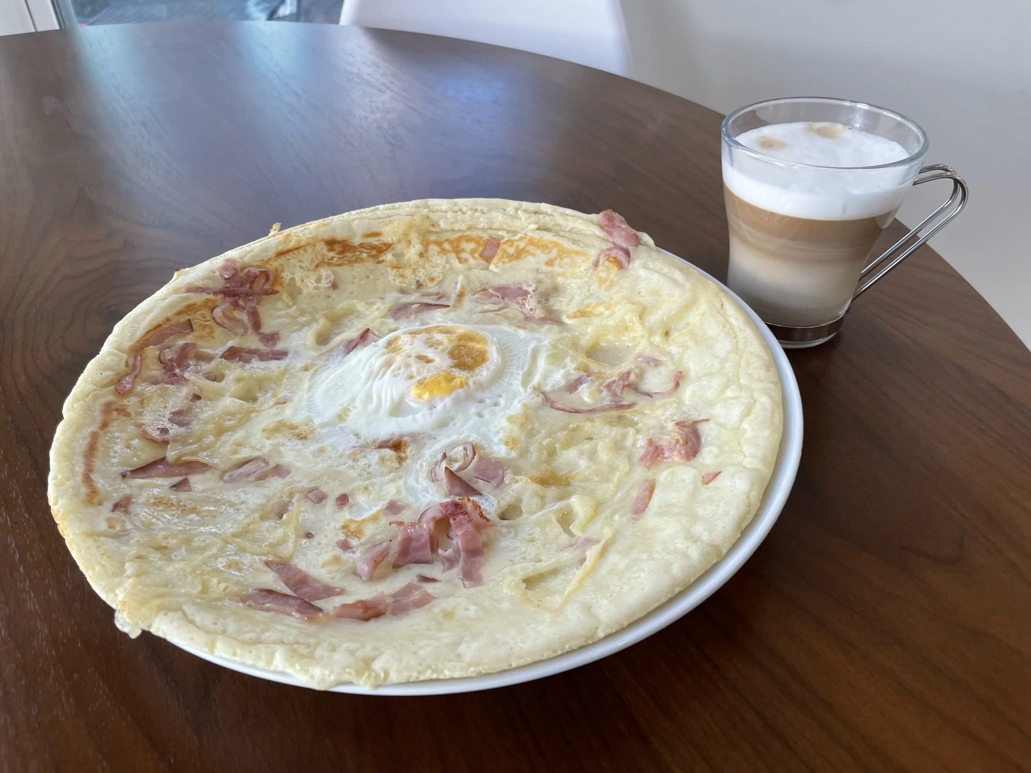 This is a classic Dutch package. It is thicker than an French crepe but not fluffy. It can be made with sweet or savory ingredients. This version is savory and is made with Ham, cheese and egg.